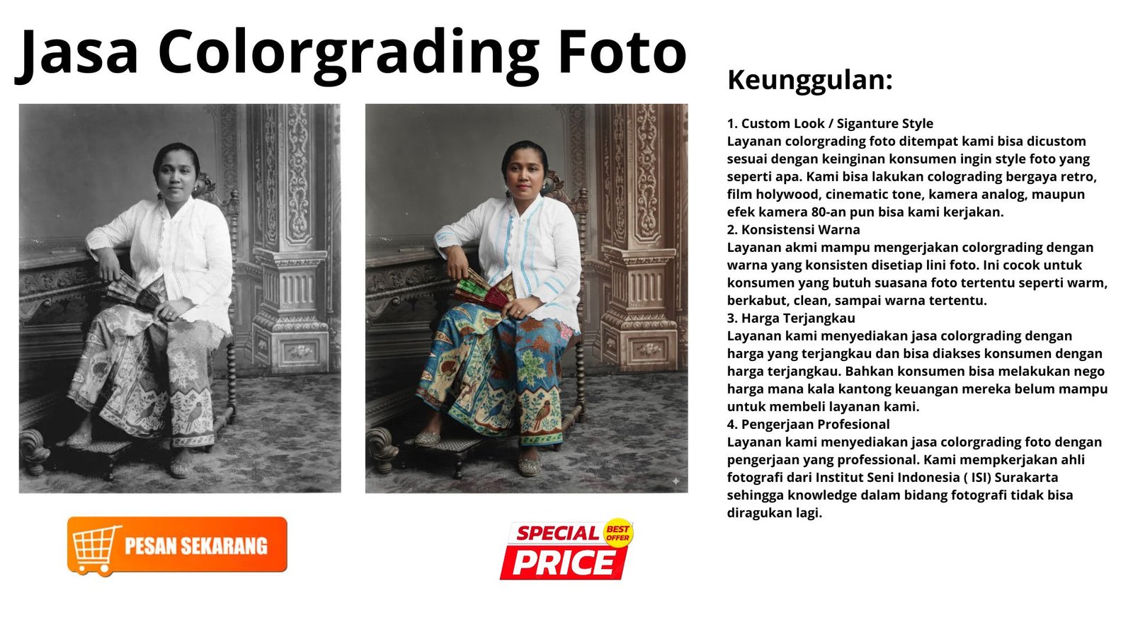 Layanan kami menyediakan jasa colorgrading foto dengan pengerjaan yang professional. Kami mempkerjakan ahli fotografi dari Institut Seni Indonesia ( ISI) Surakarta sehingga knowledge dalam bidang fotografi tidak bisa diragukan lagi.